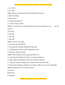 Câu 5: Một vật bị nhiễm điện có thể mang điện tích loại nào? A. điện tích dương. B. điên tích âm. C. không mang điện tích.