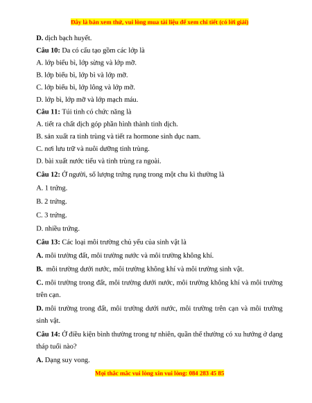 Câu 12: Ở người, số lượng trứng rụng trong một chu kì thường là A. 1 trứng. B. 2 trứng. C. 3 trứng. D. nhiều trứng.
