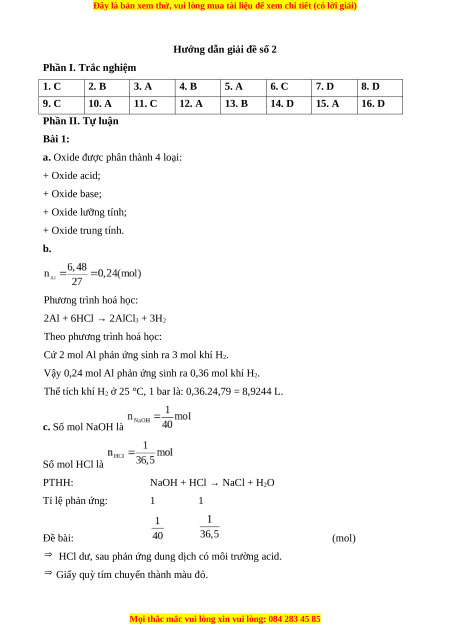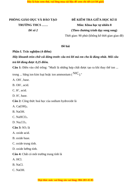 Câu 2: Công thức hoá học của sodium hydroxide là A. Ca(OH)2. B. NaOH. C. NaHCO3. D. Na2CO3. Câu 3: SO2 là A. oxide acid. B. oxide base. C. oxide trung tính. D. oxide lưỡng tính.