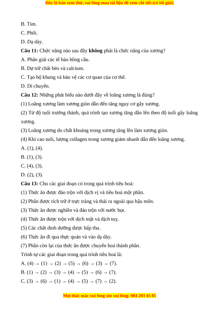 Câu 13: Cho các giai đoạn có trong quá trình tiêu hoá: