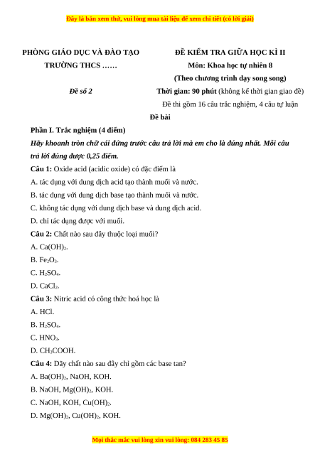 Câu 1: Oxide acid (acidic oxide) có đặc điểm là