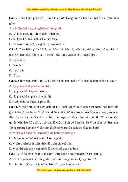 Câu 7. Theo Hiến pháp 2013, mọi hành vi chống lại độc lập, chủ quyền, thống nhất và