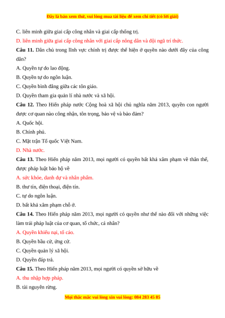 Câu 12. Theo Hiến pháp nước Cộng hoà xã hội chủ nghĩa năm 2013, quyền con người