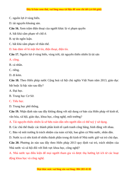 Câu 17. Nguồn lợi ở vùng biển, vùng trời, tài nguyên thiên nhiên là tài sản A. công. B. cá nhân. C. riêng. D. đi kèm.