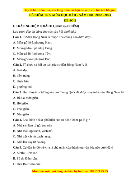 Câu 2. Tổ chức xã hội cơ bản của cư dân Đông Nam Á là A. lãnh địa. B. điền trang. C. làng/ bản. D. phường hội.