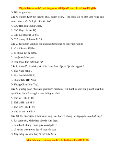Câu 8. Kinh đô của nhà nước Văn Lang được đặt tại địa phương nào? A. Phú Xuân (Huế). B. Hoa Lư (Ninh Bình). C. Phong Khê (Hà Nội). D. Phong Châu (Phú Thọ).