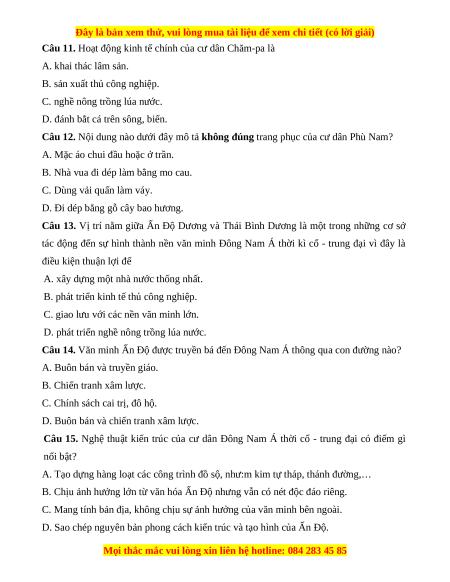Câu 11. Hoạt động kinh tế chính của cư dân Chăm-pa là A. khai thác lâm sản.