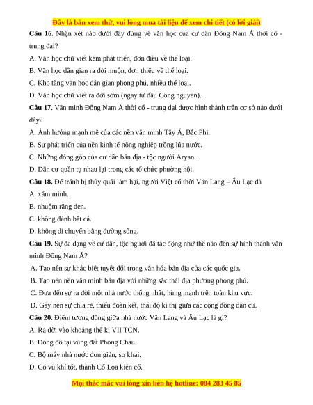 Câu 16. Nhận xét nào dưới đây đúng về văn học của cư dân Đông Nam Á thời cổ - trung đại?