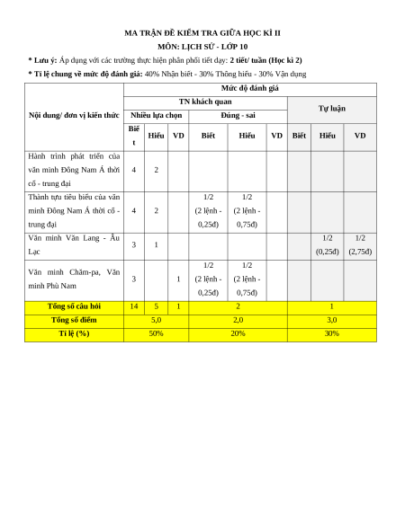 minh Đông Nam Á thời cổ - 4 2 (2 lệnh - (2 lệnh - trung đại 0,25đ) 0,75đ) Văn minh Văn Lang - Âu 1/2 1/2 3 1 Lạc (0,25đ) (2,75đ) 1/2 1/2 Văn minh Chăm-pa, Văn 3 1 (2 lệnh - (2 lệnh - minh Phù Nam 0,25đ) 0,75đ) Tổng số câu hỏi 14 5 1 2 1 Tổng số điểm 5,0 2,0 3,0 Tỉ lệ (%) 50% 20% 30%
