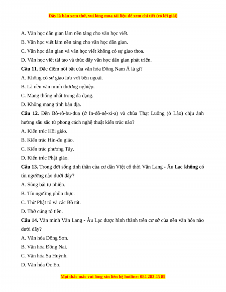 Câu 14. Văn minh Văn Lang - Âu Lạc được hình thành trên cơ sở của nền văn hóa nào dưới đây? A. Văn hóa Đông Sơn. B. Văn hóa Đồng Nai. C. Văn hóa Sa Huỳnh. D. Văn hóa Óc Eo.