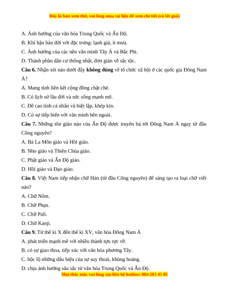 Câu 9. Từ thế kỉ X đến thế kỉ XV, văn hóa Đông Nam Á