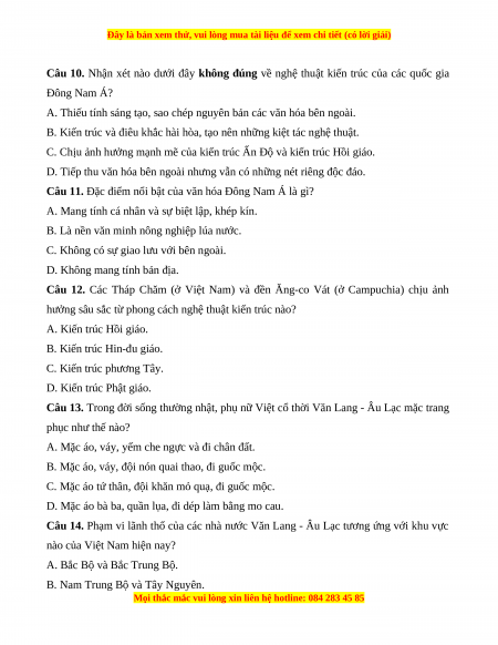 Câu 10. Nhận xét nào dưới đây không đúng về nghệ thuật kiến trúc của các quốc gia Đông Nam Á?