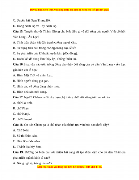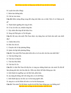 Câu 18. Cư dân Chăm-pa là chủ nhân của thành tựu văn hóa nào dưới đây? A. Chữ Nôm. N. Sử thi Đăm-săn. C. Đền Bô-rô-bu-đua. D. Thánh địa Mỹ Sơn.