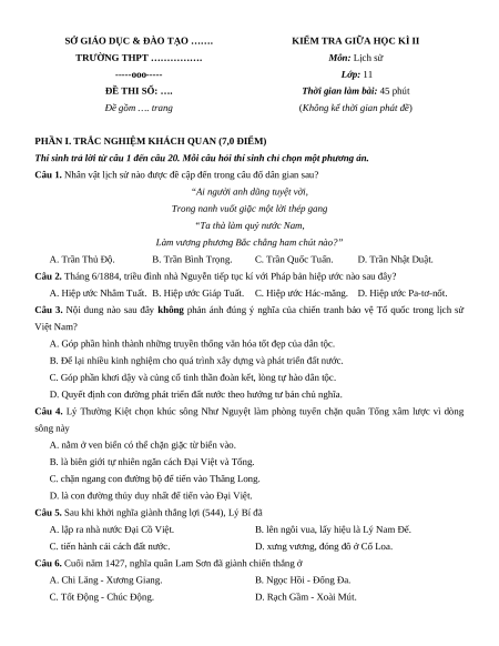 Đề thi giữa kì 2 Lịch sử 11 Cánh diều Cấu trúc mới 2025 - Đề 7