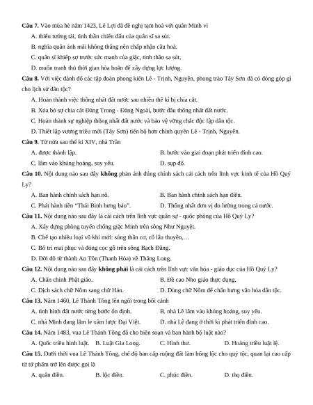 Câu 12. Nội dung nào sau đây không phải là cải cách trên lĩnh vực văn hóa - giáo dục của Hồ Quý Ly?