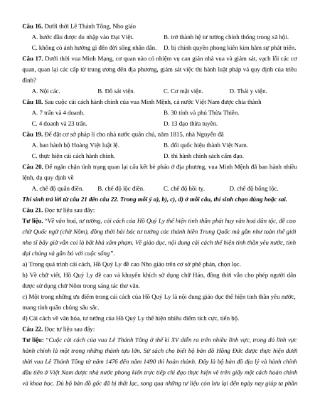 Câu 16. Dưới thời Lê Thánh Tông, Nho giáo