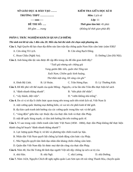 Câu 1. Ngô Quyền đã lựa chọn địa điểm nào làm trận địa chống quân Nam Hán xâm lược (năm 938)? A. Cửa sông Tô Lịch. B. Cửa sông Bạch Đằng. C. Hoan Châu (Nghệ An). D. Đường Lâm (Hà Nội).