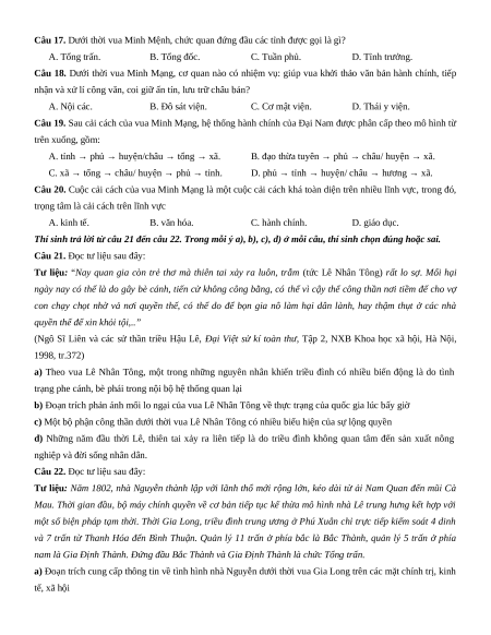 Câu 17. Dưới thời vua Minh Mệnh, chức quan đứng đầu các tỉnh được gọi là gì? A. Tổng trấn. B. Tổng đốc. C. Tuần phủ. D. Tỉnh trưởng.