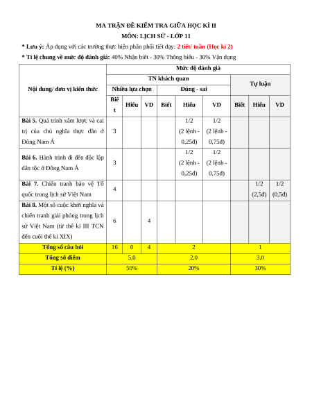 sử Việt Nam (từ thế kỉ III TCN đến cuối thế kỉ XIX) Tổng số câu hỏi 16 0 4 2 1 Tổng số điểm 5,0 2,0 3,0 Tỉ lệ (%) 50% 20% 30%