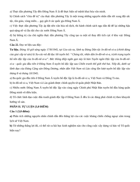 Câu 5. Trong những năm 1920 - 1939, nhân dân các dân tộc Đông Nam Á tiếp tục cuộc đấu tranh chống