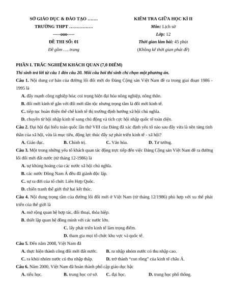 Đề thi giữa kì 2 Lịch sử 12 Cánh diều 2025 (Đề 3)