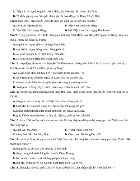 Câu 9. Trong giai đoạn 1941-1945, thông qua Mặt trận Việt Minh, hoạt động đối ngoại của Đảng Cộng sản