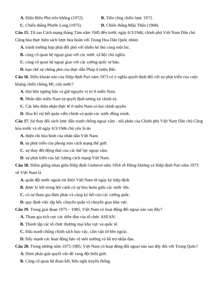 Câu 20. Trong những năm 1975-1985, Việt Nam có hoạt động đối ngoại nào sau đây đối với Trung Quốc?