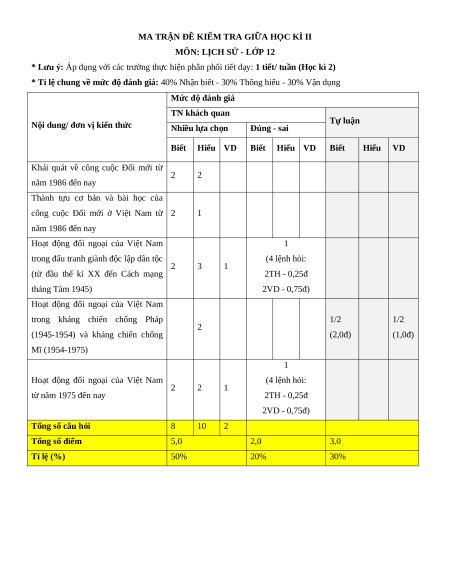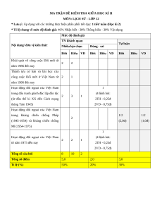 Hoạt động đối ngoại của Việt Nam (4 lệnh hỏi: 2 2 1 từ năm 1975 đến nay 2TH - 0,25đ 2VD - 0,75đ) Tổng số câu hỏi 8 10 2 Tổng số điểm 5,0 2,0 3,0 Tỉ lệ (%) 50% 20% 30%