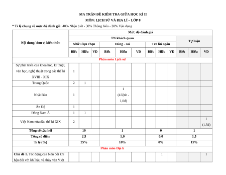 Việt Nam nửa đầu thế kỉ XIX 2 (1,5đ) Tổng số câu hỏi 10 1 0 1 Tổng số điểm 2,5 1,0 0,0 1,5 Tỉ lệ (%) 25% 10% 0% 15% Phân môn Địa lí