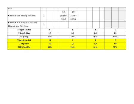 Chủ đề 3. Văn minh châu thổ sông 3 Hồng và sông Cửu Long. Tổng số câu hỏi 6 1 1 1 Tổng số điểm 1,5 1,0 1,0 1,5 Tỉ lệ (%) 15% 10% 10% 15% Tổng số câu hỏi 16 2 1 2 Tổng điểm 4,0 2,0 1,0 3,0 Tỉ lệ (%) điểm 40% 20% 10% 30%