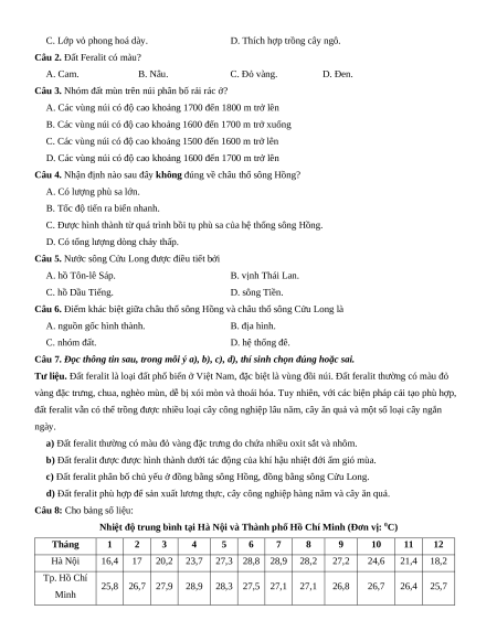 Câu 1. Đặc điểm nào sau đây không đúng với đất feralit ở nước ta?