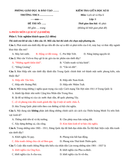 Đề thi giữa kì 2 Lịch sử & Địa lí 8 Cánh diều - Đề 3 Cấu trúc mới