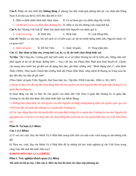 A-PHÂN MÔN LỊCH SỬ (5,0 ĐIỂM)