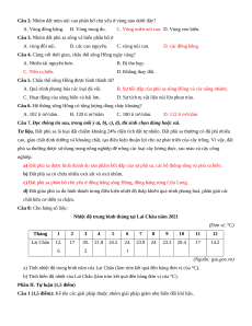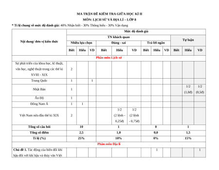 Việt Nam nửa đầu thế kỉ XIX 2 (2 lệnh - (2 lệnh 0,25đ) - 0,75đ) Tổng số câu hỏi 10 1 0 1 Tổng số điểm 2,5 1,0 0,0 1,5 Tỉ lệ (%) 25% 10% 0% 15% Phân môn Địa lí
