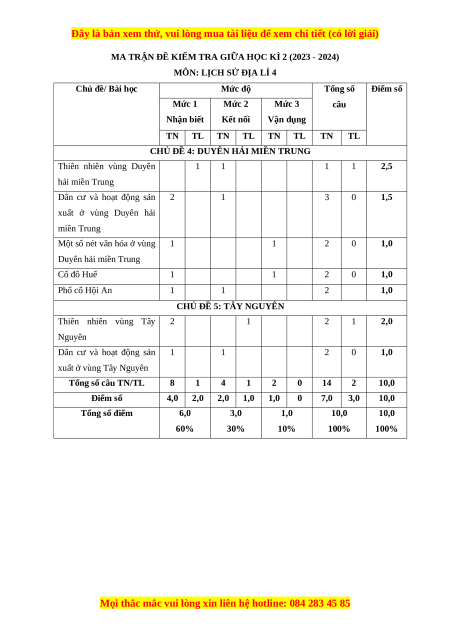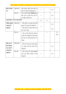 Dân cư và hoạt động sản 1 1 2 0 1,0 xuất ở vùng Tây Nguyên Tổng số câu TN/TL 8 1 4 1 2 0 14 2 10,0 Điểm số 4,0 2,0 2,0 1,0 1,0 0 7,0 3,0 10,0 Tổng số điểm 6,0 3,0 1,0 10,0 10,0 60% 30% 10% 100% 100%