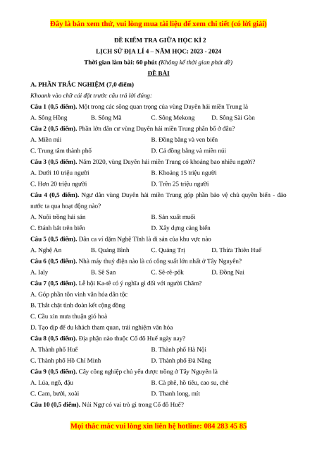 Câu 1 (0,5 điểm). Một trong các sông quan trọng của vùng Duyên hải miền Trung là A. Sông Hồng B. Sông Mã C. Sông Mekong D. Sông Sài Gòn