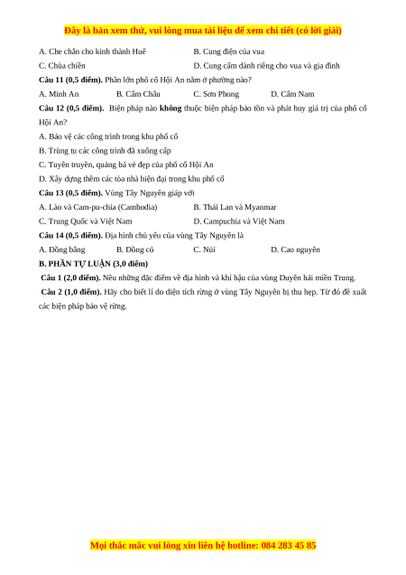 Câu 8 (0,5 điểm). Địa phận nào thuộc Cố đô Huế ngày nay? A. Thành phố Huế B. Thành phố Hà Nội C. Thành phố Hồ Chí Minh D. Thành phố Đà Nẵng