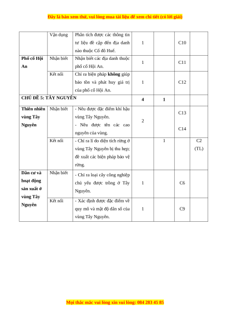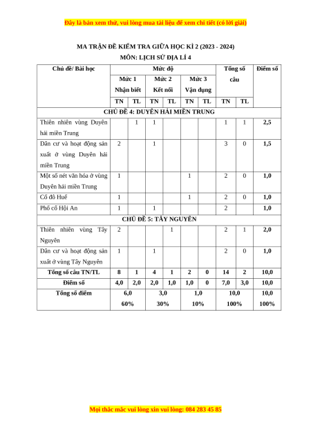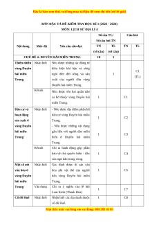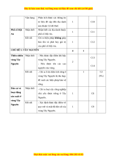 Dân cư và hoạt động sản 1 1 2 0 1,0 xuất ở vùng Tây Nguyên Tổng số câu TN/TL 8 1 4 1 2 0 14 2 10,0 Điểm số 4,0 2,0 2,0 1,0 1,0 0 7,0 3,0 10,0 Tổng số điểm 6,0 3,0 1,0 10,0 10,0 60% 30% 10% 100% 100%