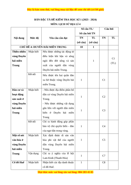 BẢN ĐẶC TẢ ĐỀ KIỂM TRA HỌC KÌ 1 (2023 - 2024)
