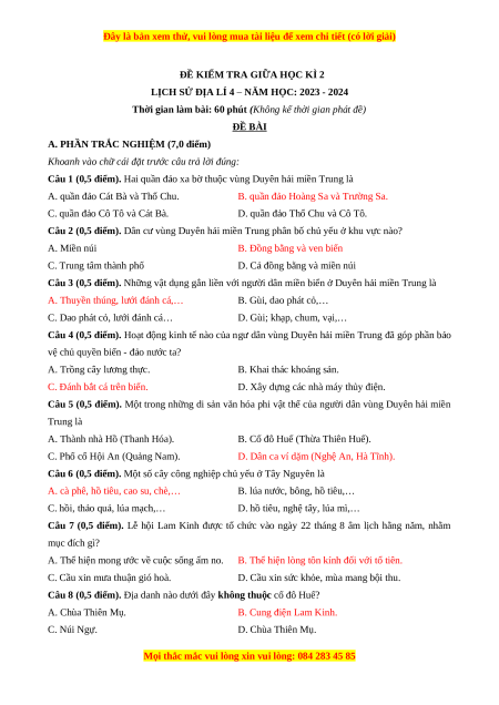 Câu 2 (0,5 điểm). Dân cư vùng Duyên hải miền Trung phân bố chủ yếu ở khu vực nào? A. Miền núi