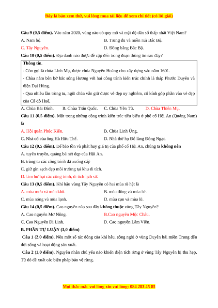 Câu 8 (0,5 điểm). Địa danh nào dưới đây không thuộc cố đô Huế? A. Chùa Thiên Mụ. B. Cung điện Lam Kinh. C. Núi Ngự. D. Chùa Thiên Mụ.