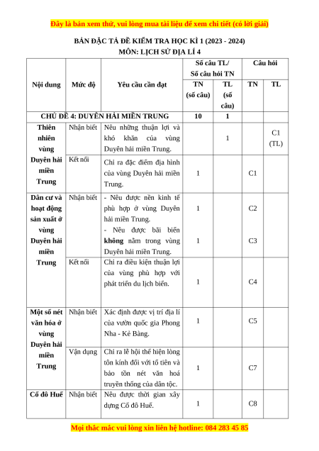 CHỦ ĐỀ 4: DUYÊN HẢI MIỀN TRUNG Thiên nhiên vùng 1 1 1 1 2,5 Duyên hải miền Trung Dân cư và hoạt động 2 1 3 0 1,5 sản xuất ở vùng Duyên hải miền Trung Một số nét văn hóa ở 1 1 2 0 1,0 vùng Duyên hải miền Trung Cố đô Huế 1 1 2 0 1,0 Phố cổ Hội An 1 1 2 1,0