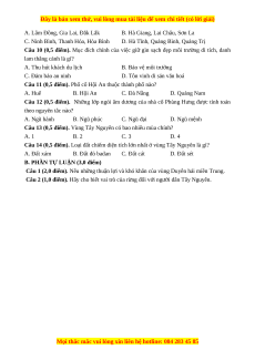 Câu 3 (0,5 điểm). Bãi biển nào không nằm trong vùng Duyên hải miền Trung? A. Cảnh Dương B. Mỹ Khê C. Nha Trang D. Cô Tô