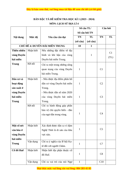 BẢN ĐẶC TẢ ĐỀ KIỂM TRA HỌC KÌ 1 (2023 - 2024)