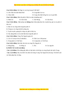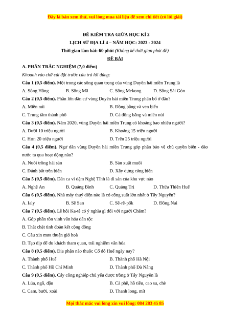Câu 1 (0,5 điểm). Một trong các sông quan trọng của vùng Duyên hải miền Trung là A. Sông Hồng B. Sông Mã C. Sông Mekong D. Sông Sài Gòn