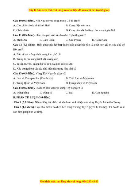 Câu 8 (0,5 điểm). Địa phận nào thuộc Cố đô Huế ngày nay? A. Thành phố Huế B. Thành phố Hà Nội C. Thành phố Hồ Chí Minh D. Thành phố Đà Nẵng