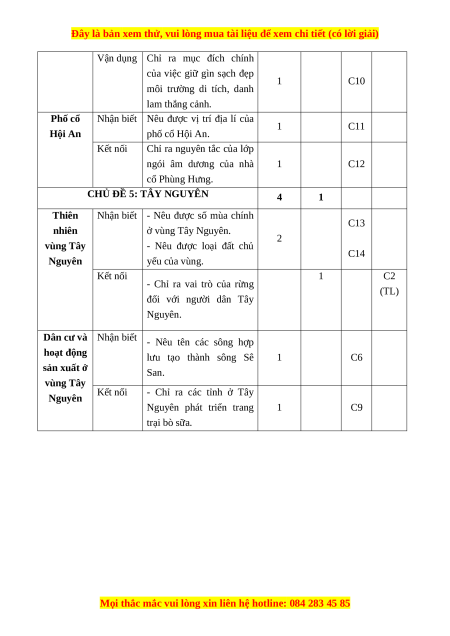 CHỦ ĐỀ 5: TÂY NGUYÊN Thiên nhiên vùng Tây 2 1 2 1 2,0 Nguyên Dân cư và hoạt động 1 1 2 0 1,0 sản xuất ở vùng Tây Nguyên Tổng số câu TN/TL 8 1 4 1 2 0 14 2 10,0 Điểm số 4,0 2,0 2,0 1,0 1,0 0 7,0 3,0 10,0