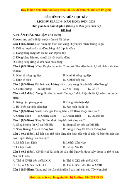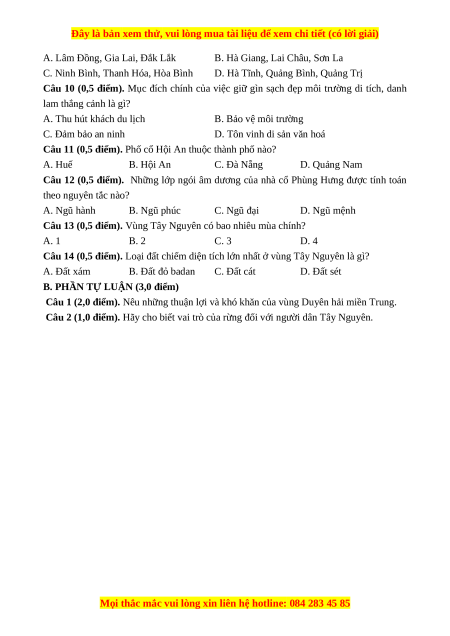 Câu 3 (0,5 điểm). Bãi biển nào không nằm trong vùng Duyên hải miền Trung? A. Cảnh Dương B. Mỹ Khê C. Nha Trang D. Cô Tô