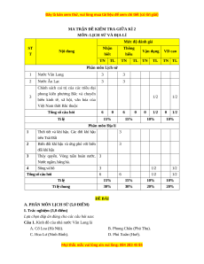 MÔN: LỊCH SỬ VÀ ĐỊA LÍ Mức độ đánh giá ST Nhận Thông Nội dung Vận dụng VD cao T biết hiểu TN TL TN TL TN TL TN TL Phân môn Lịch sử 1 Nước Văn Lang 3 3 2 Nước Âu Lạc 3 3