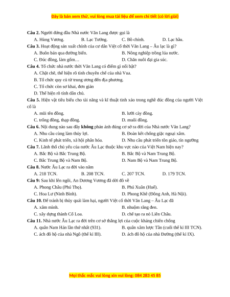 Câu 8. Nước Âu Lạc ra đời vào năm A. 218 TCN. B. 208 TCN. C. 207 TCN. D. 179 TCN.